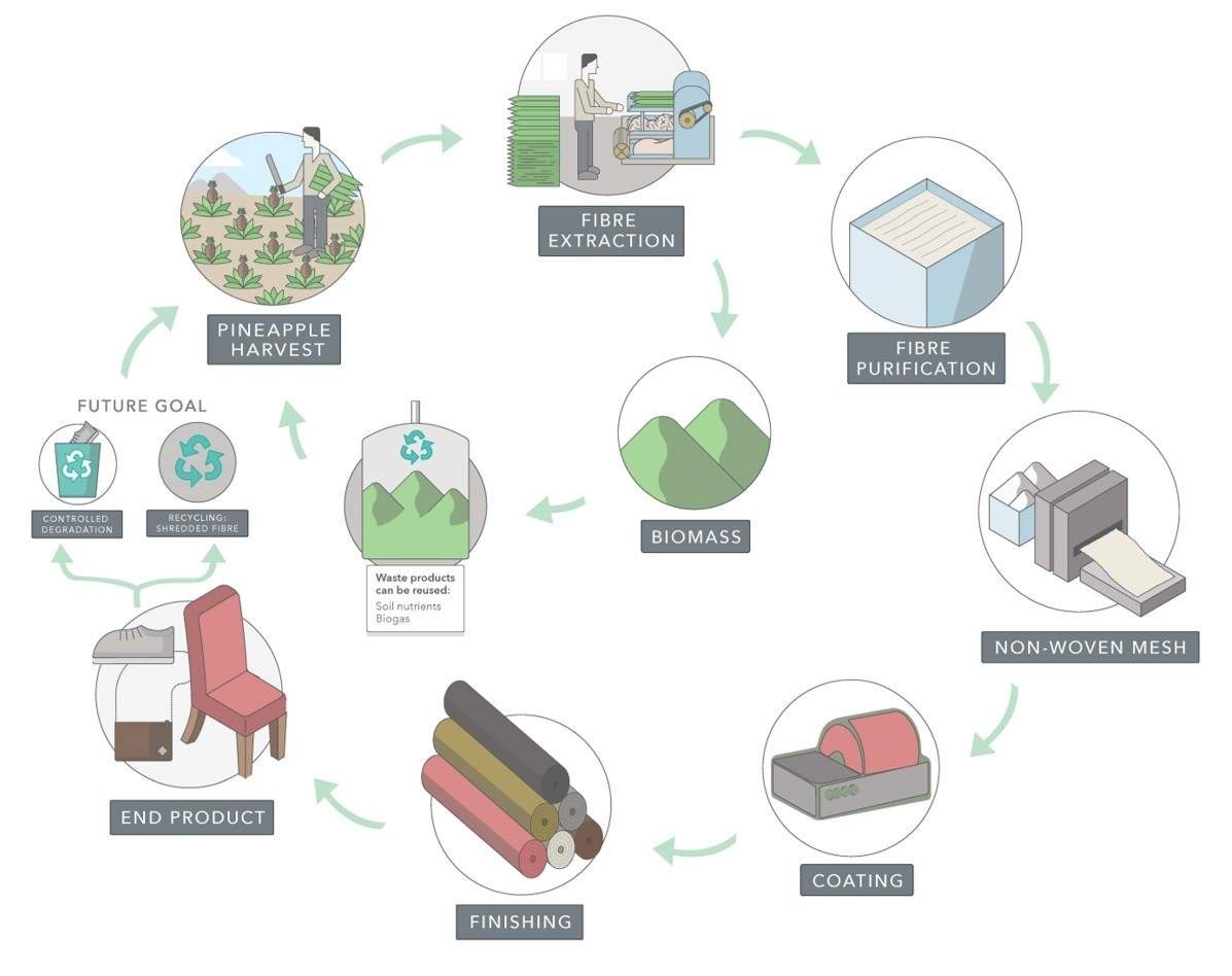 Pinatex 是一種由鳳梨葉製成的植物性皮革,其創辦人為英國設計師Carmen Hijosa。Carmen Hijosa 在 1990 年代曾在菲律賓擔任皮革產業顧問,當時她對於傳統的動物皮革產業不斷的發展中對環境及動物福利的負面影響感到擔憂。在進一步了解當地的農業環境後,她意識到鳳梨葉這種資源在當地的種植過程中,會被視為廢棄物而被棄置,於是她開始探索利用鳳梨葉創造一種可持續性的皮革替代品。